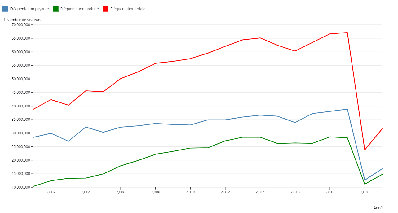 Représentation de l’évolution du nombre de fréquentation dans les musées au court du temps et en fonction du type d’entrée et analyse de cette augmentation