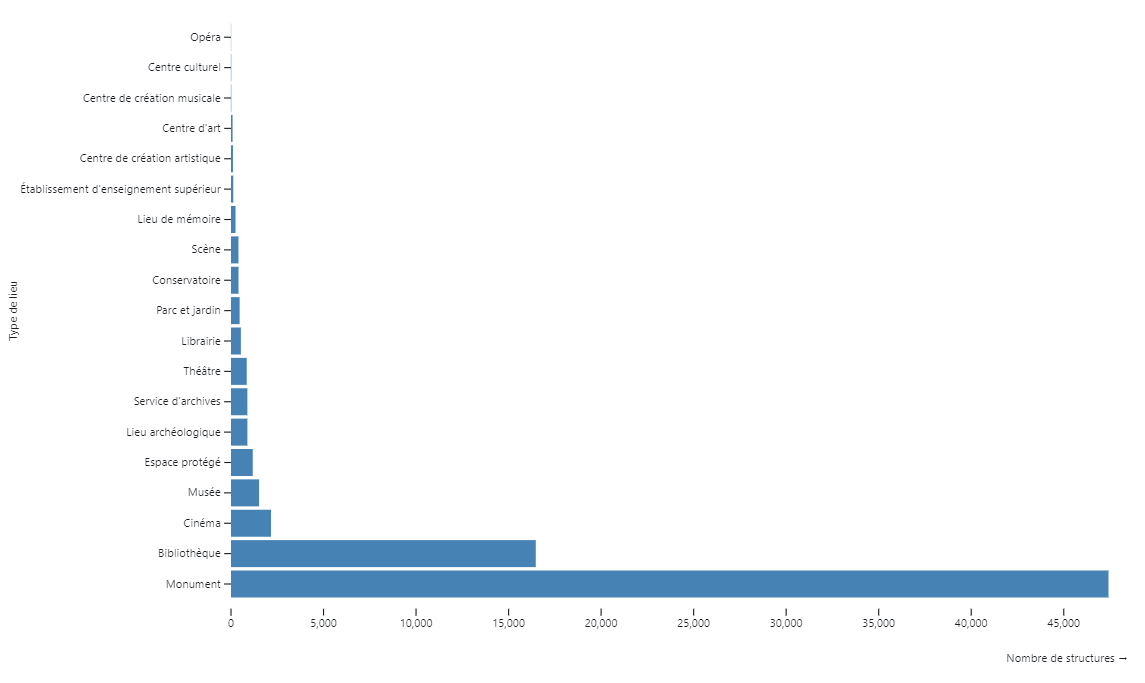 Les différentes catégories de lieux culturels en France et leur quantité, de la plus basse à la plus élevée ainsi que leur emplacement sur le territoire.